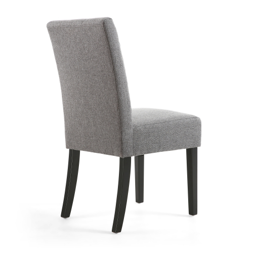 A modern deep seated dining chair with stitched waffle detailing on the back, upholstered in steel grey linen effect fabric. Sprung and belted seat. Available in black rubberwood legs. Assembly required. Sold in boxes of 2.